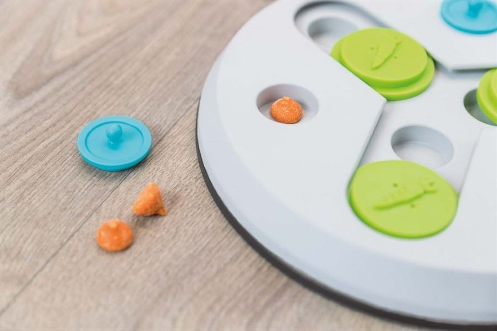 Aktivitetsspel för smådjur. Spelbrädet har 3 lock och olika fördjupningar, uppfällbara lock och skjutlock för att din djurvän ska kunna aktivera hjärnan för att lista ut hur den får godbitarna du lagt dit.