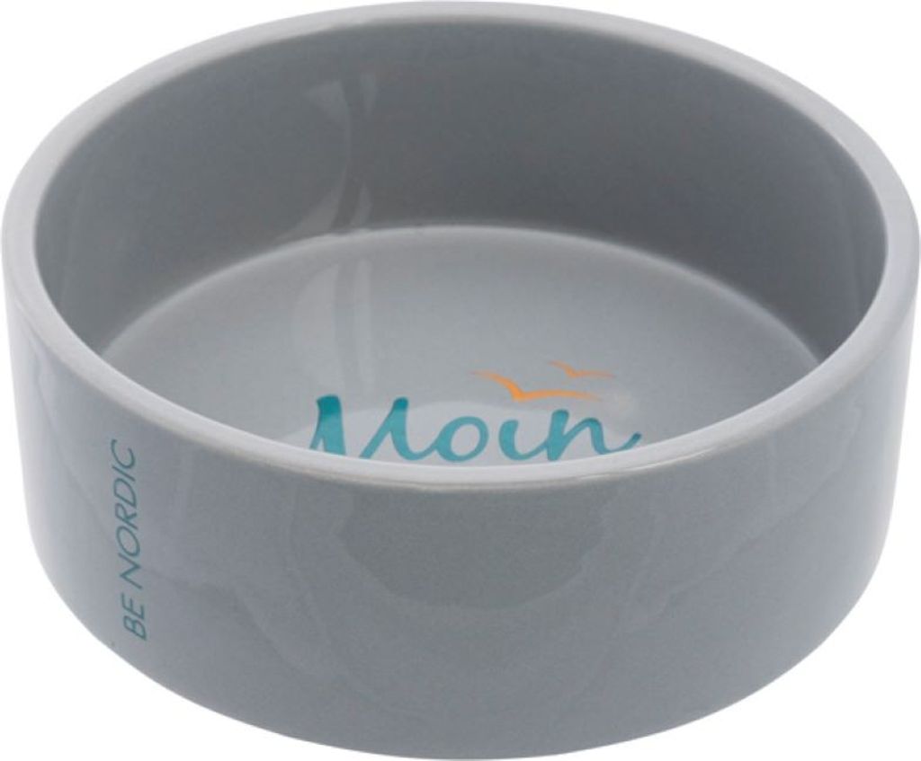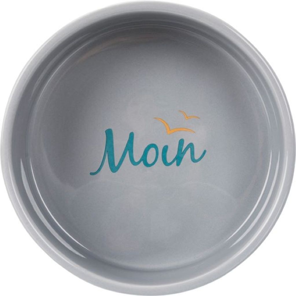Skål i keramik med marint tema. Stilrena färger och med dekorativ text i botten. Texten ”Moin Moin” är tysk och betyder ”Hallå”.