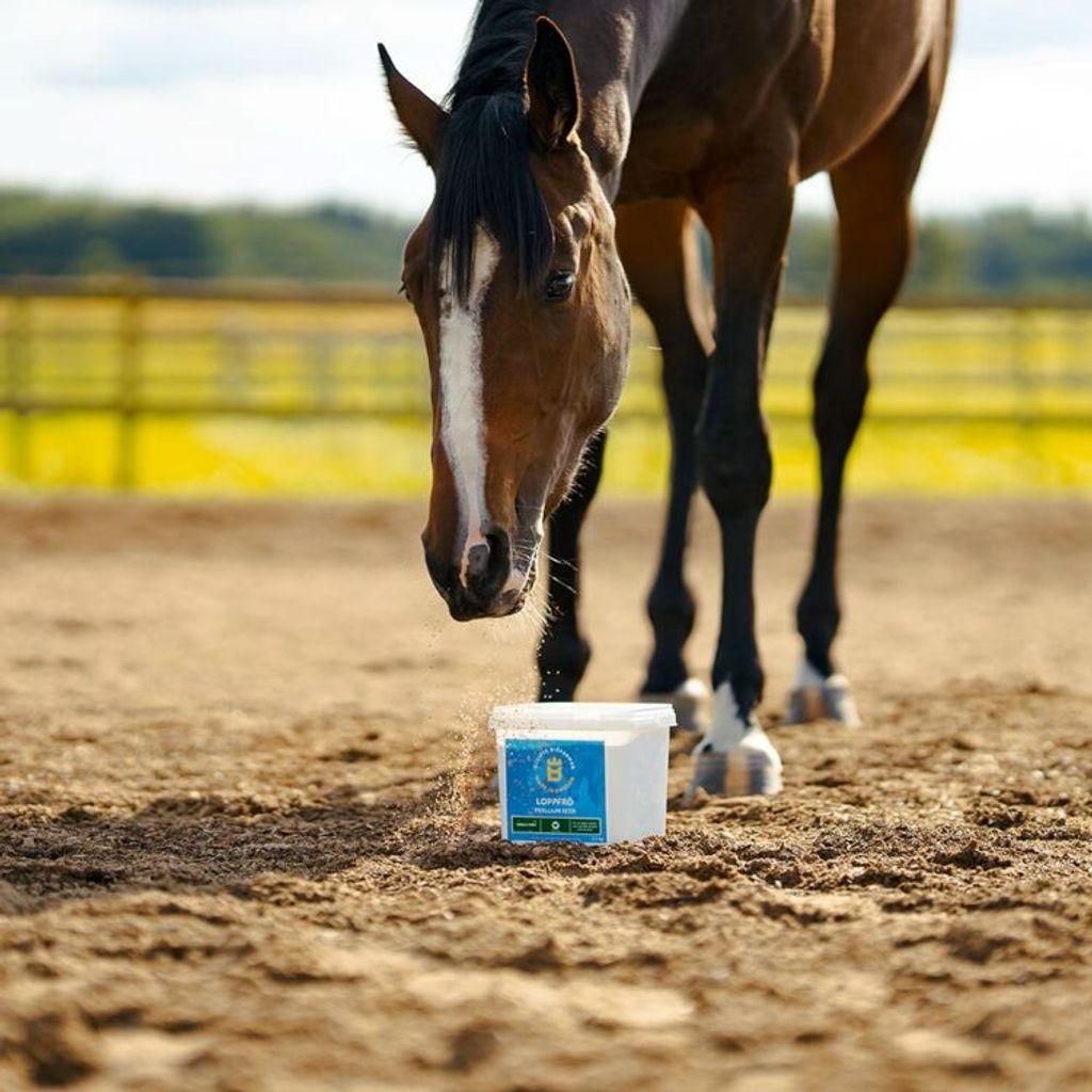 Loppfrö är ett naturligt kompletteringsfoder som lämpar sig för hästar som går på glesbevuxna beten, i grushagar eller som på annat sätt riskerar att få i sig sand, jord eller grus. När fröet kommer i kontakt med vätska bildas en geléliknande massa som underlättar transporten av sand, jord och grus genom tarmen. På så sätt kan loppfrö bidra till en sundare matsmältning och minska risken för sandrelaterade magproblem.