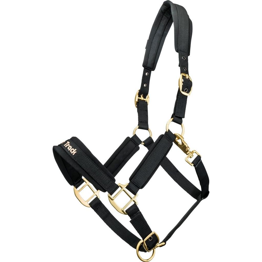 Grimman har eleganta, guldfärgade metallspännen och kan justeras och tillpassas efter din hästs storlek vid sidostycken och runt nosen. Enkel och smidig att stänga med en karbinhake.
