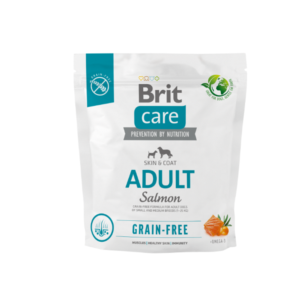 Brit Care Dog Adult Grain Free Salmon passar utmärkt för hundar med känslig hud, allergier mot andra proteinkällor än lax, och självklart för hundar som inte tål spannmål.