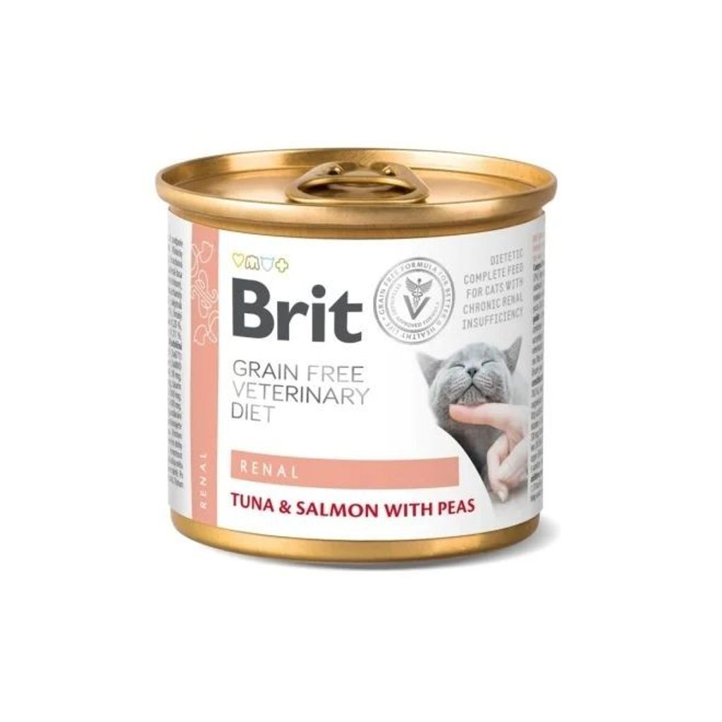 Brit Veterinary Diet Cat Can Renal Grain Free Tuna, Salmon & Pea är ett veterinärfoder särskilt anpassat för katter med njurproblem.