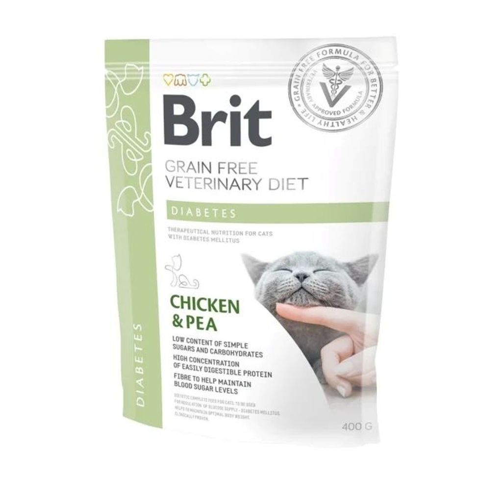Brit Veterinary Diet Cat Diabetes Grain Free Chicken & Pea är ett veterinärfoder särskilt utvecklat för katter med diabetes och är utformat för att hjälpa kroppen att reglera glukosintaget. Det kan även vara lämpligt för katter som lider av kronisk kolit.