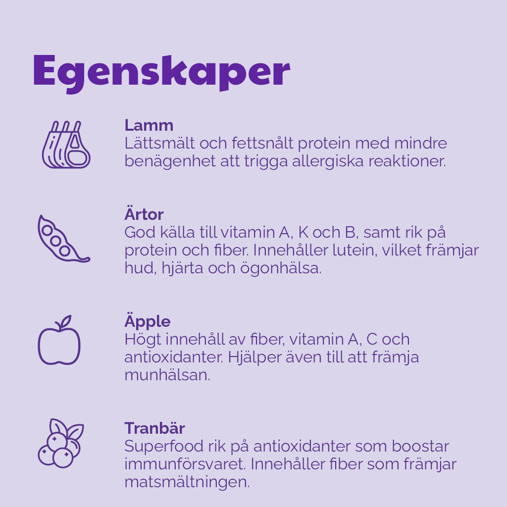 En knaprig och smakrik hundgodis gjord på färskt lamm och tranbär. Lamm är en lättsmält proteinkälla som är skonsam för magen. Ingredienserna är 100% naturliga och fri från tillsatser, spannmål och GMO. Perfekt som belöningsgodis under träning!