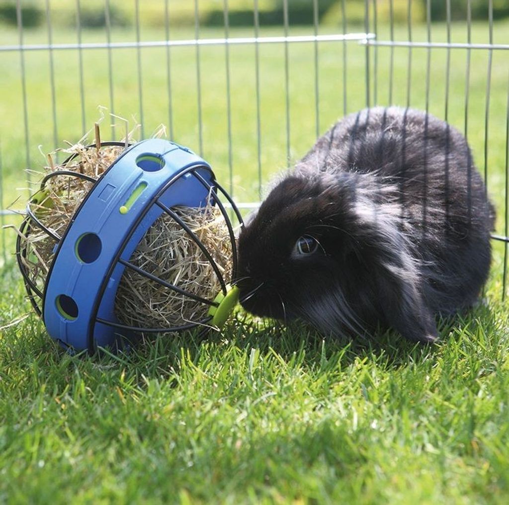 En rolig matbehållare som också gör att din kanin, marsvin eller andra lite större smådjur aktiveras. Kan fyllas med hö, sallad eller något annat gott. Kan ställas på botten eller fästas i gallret. Hållare ingår.