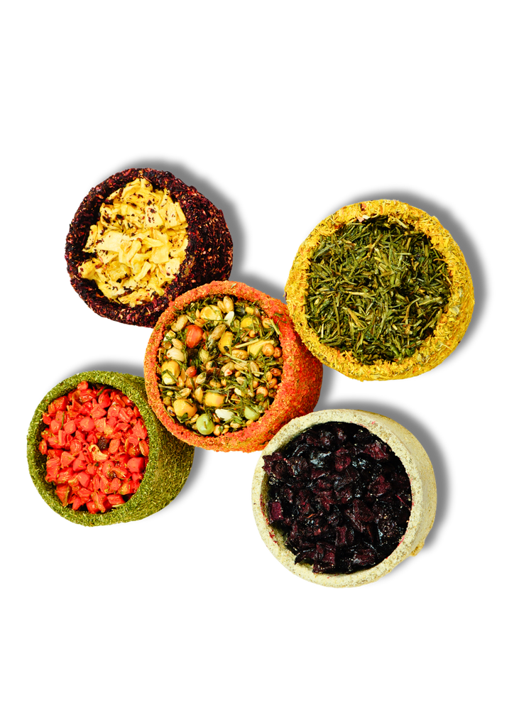 Ingredienser: palsternacka, rödbeta, morot, persilja, ringblomma, hibiskus, majs, bönor, vete, sorghum, röd majs, solros, hirs, fältärtor, havre, dari, safflor, cellulosa och stärkelse,