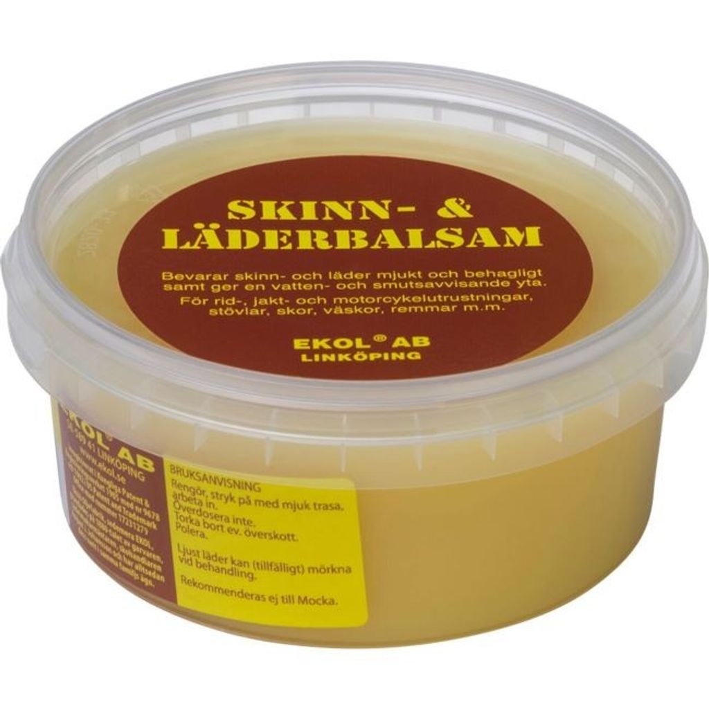 Skinn- och läderbalsam från Ekol som bevarar mjukheten i läder- och skinnprodukter samtidigt som det ger en smuts- och vattenavvisande effekt.