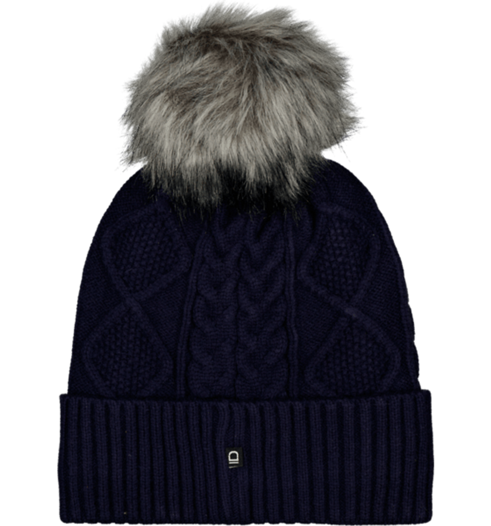 Kabelstickad mössa med avtagbar pompom i fuskpäls. Trendig mössa som håller dig varm även de kallaste dagarna med sitt innerfoder i polar-fleece. Materialet gör att den håller formen även vid daglig användning.