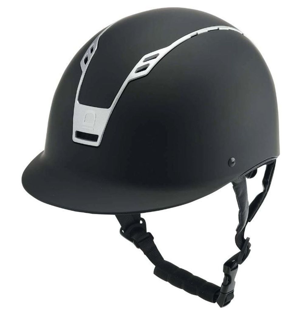 Prisvärd och stilig ridhjälm från Equipage. Elegant matt finish samt detaljer i silver.