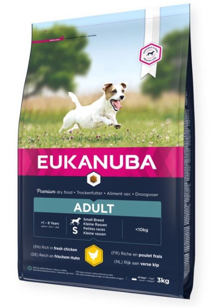 Eukanuba torrfoder är perfekt för vuxna hundar av liten ras i åldern 1 till 8 år, och är berikat med färsk kyckling.
