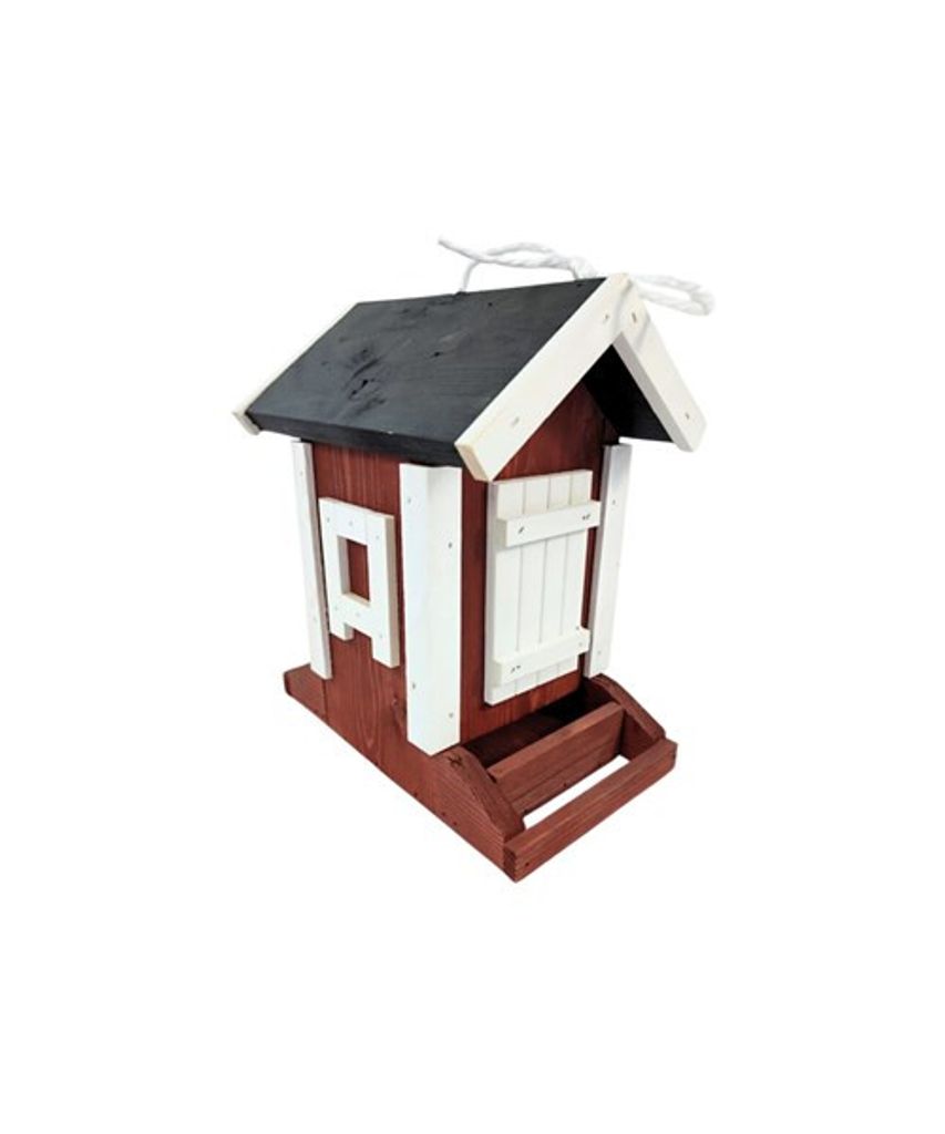 Denna fågelmataren ser ut som ett rött torp, gullig och fin att ha i trädgården.