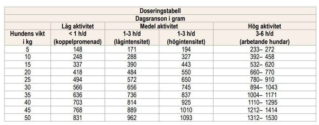 Rekommenderad daglig fodergiva i gram visas i fodertabellen på bild 2. Fodergivan kan behöva minskas eller ökas beroende på hundens aktivitet.