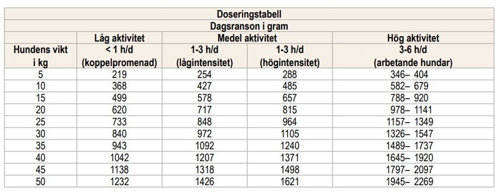 Rekommenderad daglig fodergiva i gram visas i fodertabellen på bild 2. Fodergivan kan behöva minskas eller ökas beroende på hundens aktivitet.