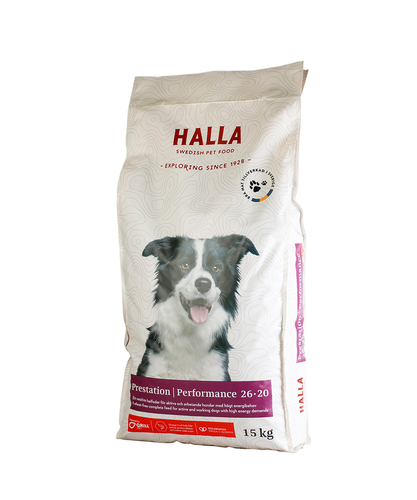 Halla Medium Prestation Performance är ett vetefritt helfoder för aktiva och arbetande hundar med högt energibehov.