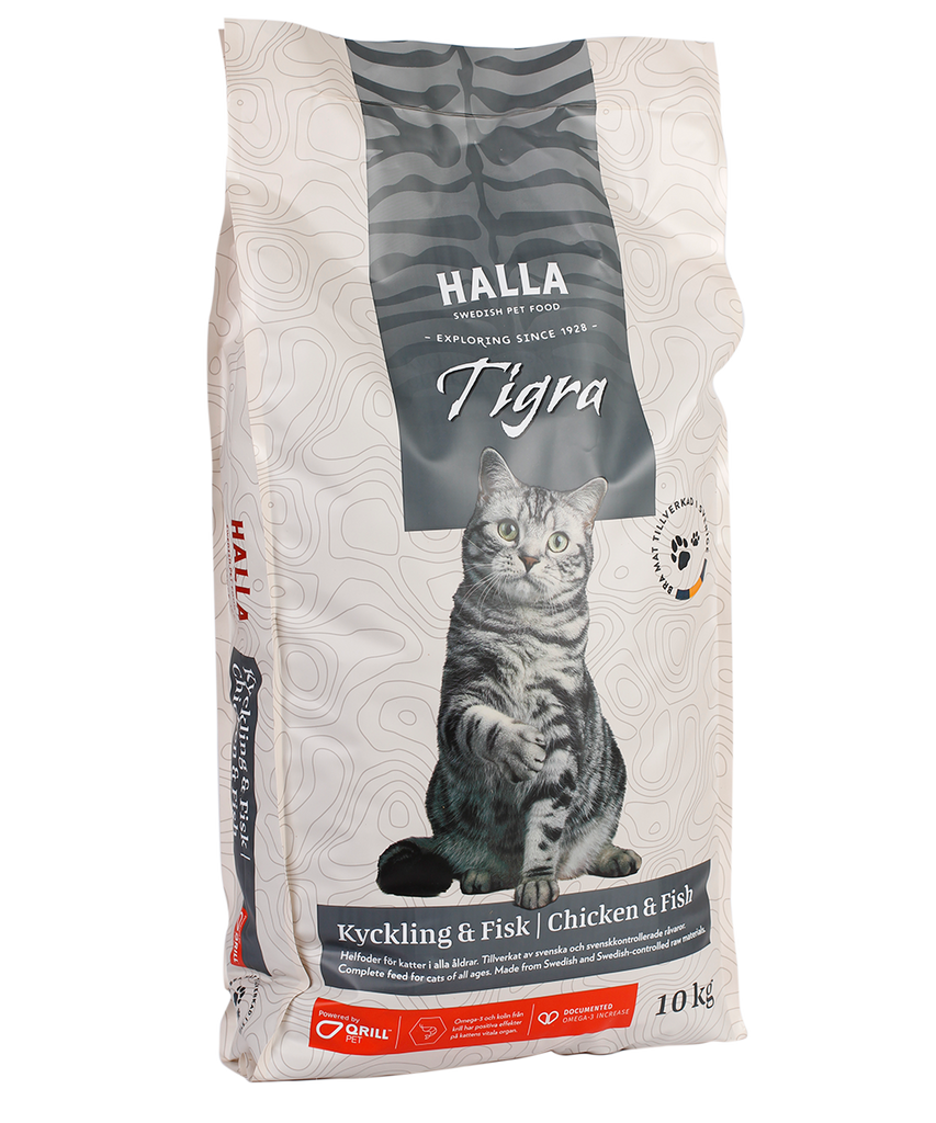Hallas foder tilltalar din katt lite extra då det unika receptet tillsammans med den höga kötthalten gör att fodret har en hög smaklighet. Att foderkulorna är spröda, knapriga och dessutom har en hög smältbarhet gör att du som kattägare kan känna dig trygg med att din katt kommer älska Tigra Kyckling & Fisk.