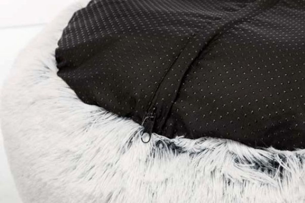 En praktisk funktion är den ordentligt fastsatta dynan, som håller sig på plats under användning. Överdraget på bädden är avtagbart, vilket gör det enkelt att tvätta och hålla rent. För att säkerställa att bädden står stabilt på plats, även på hala golv, har den en halkfri botten.