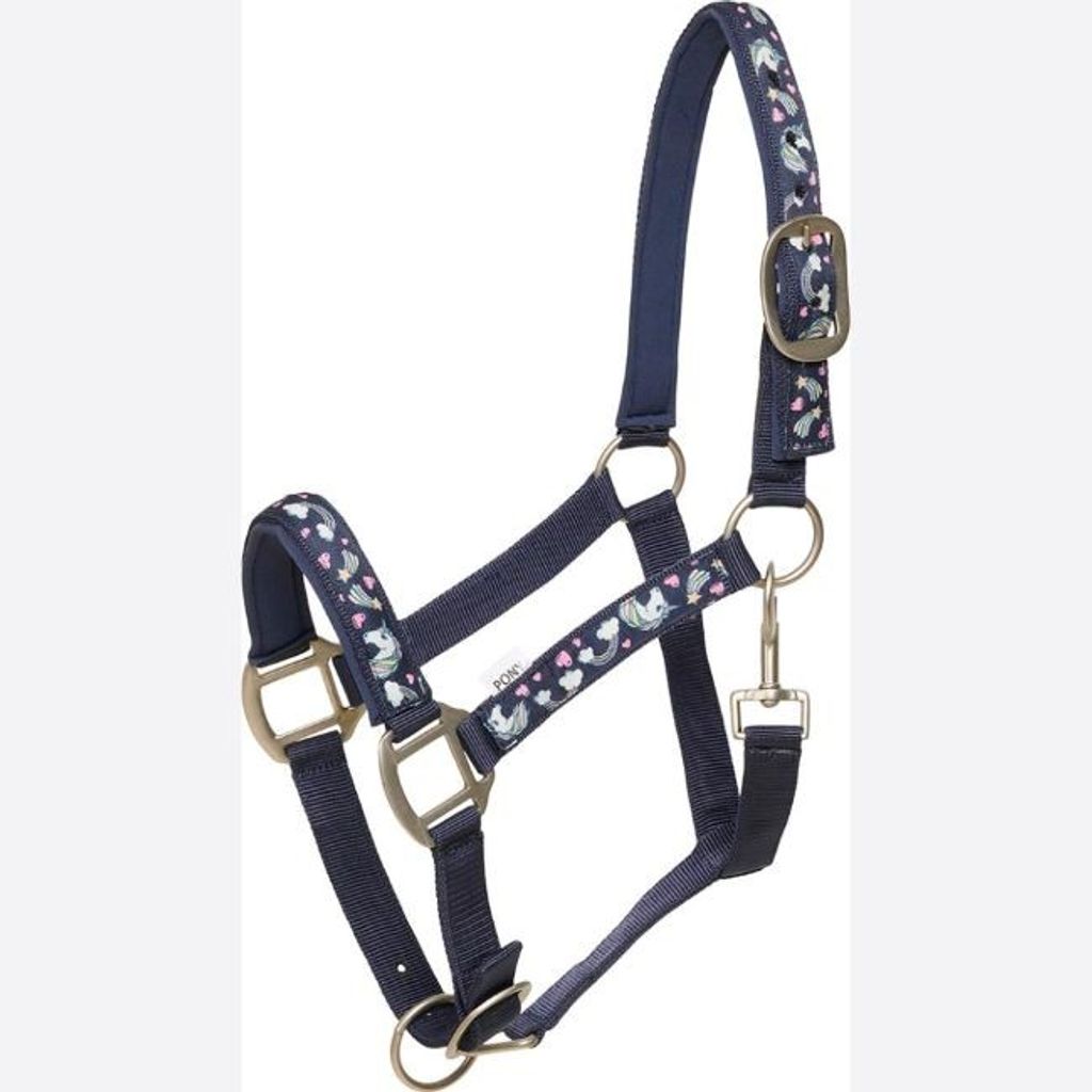 Bekväm och justerbar grimma från Horse Guard. Snyggt tryck med enhörningar, hjärtan, stjärnfall och regnbågar på en marinblå bakgrund.