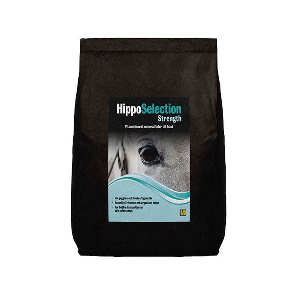 HippoSelection Strength innehåller organiskt selen och naturligt E-vitamin. Båda verkar som antioxidanter och har en positiv effekt på immunförsvaret vilket är särskilt viktigt under den påfrestande tiden vid fölning eller under unghästars tillväxtperiod. Organiskt selen och naturligt E-vitamin tas upp och utnyttjas bättre och går i hög utsträckning över till mjölken så att det blir tillgängligt för det nyfödda fölet. Fölets immunförsvar och selenstatus förbättras vilket ger piggare och livskraftigare föl. Förutom vitamin A, D och E är också flertalet B-vitaminer, däribland biotin, tillsatta för att gynna t.ex. kvaliteten på päls och hovar.