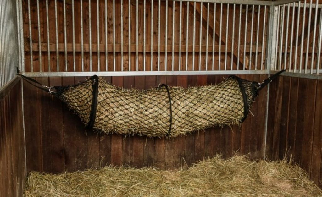 Praktisk hötunnel som kan fyllas från båda sidor och håller stora mängder hö, hängs praktiskt tvärs över hela boxen.