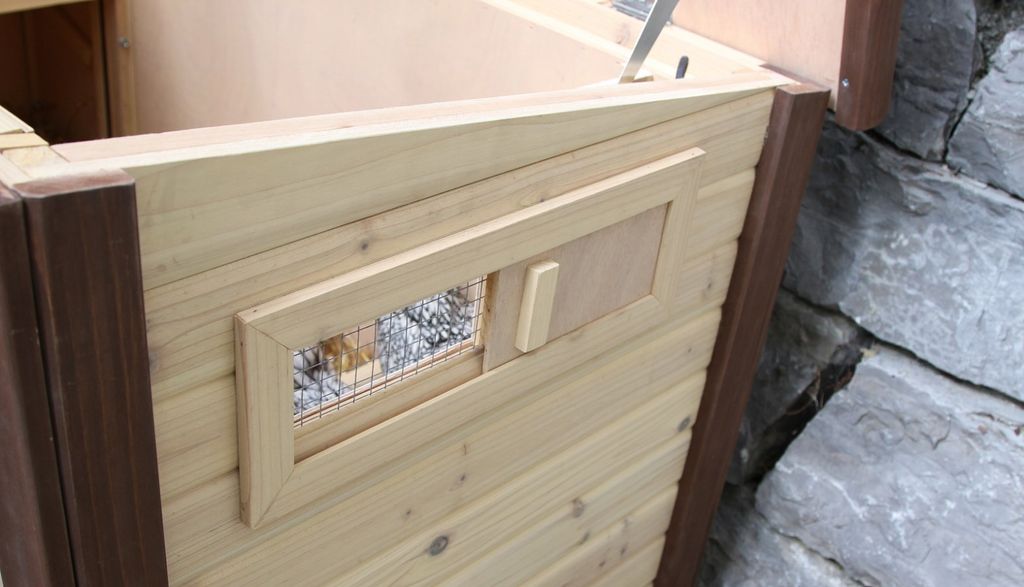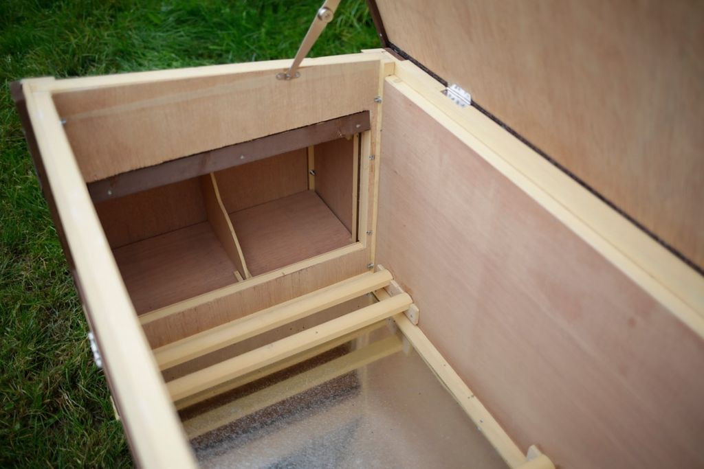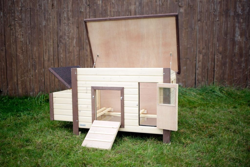 Två smidiga ingångar och öppningsbart tak med gångjärn som gör det enkelt att fylla på foder, vatten och för rengöring.