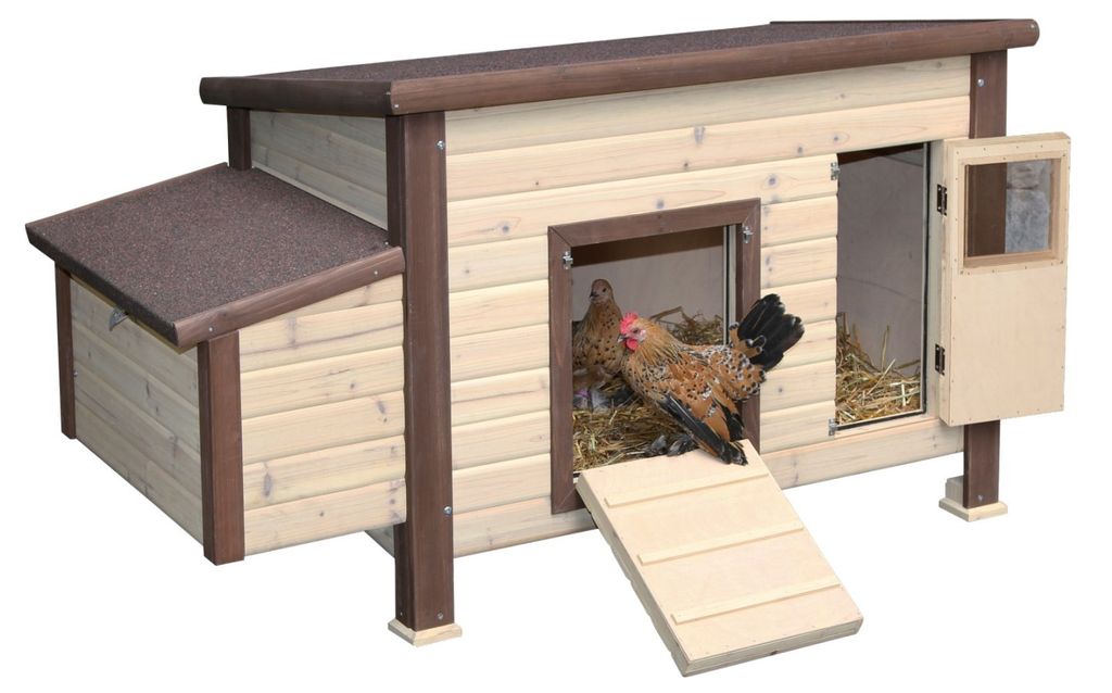 Hönshuset är välutrustat med funktioner som främjar både hönsens välmående och användarvänlighet: