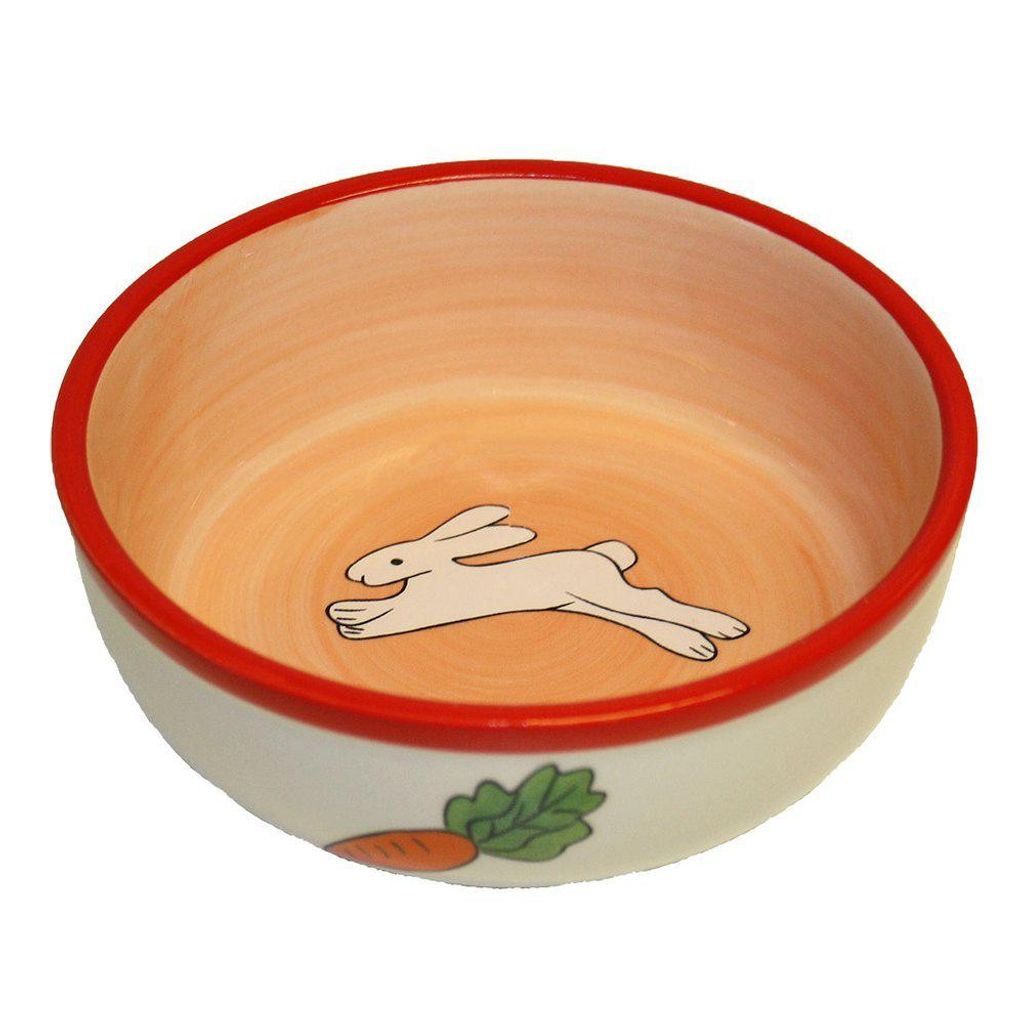 Vit keramikskål med röd kant och motivet av en kanin och en morot.