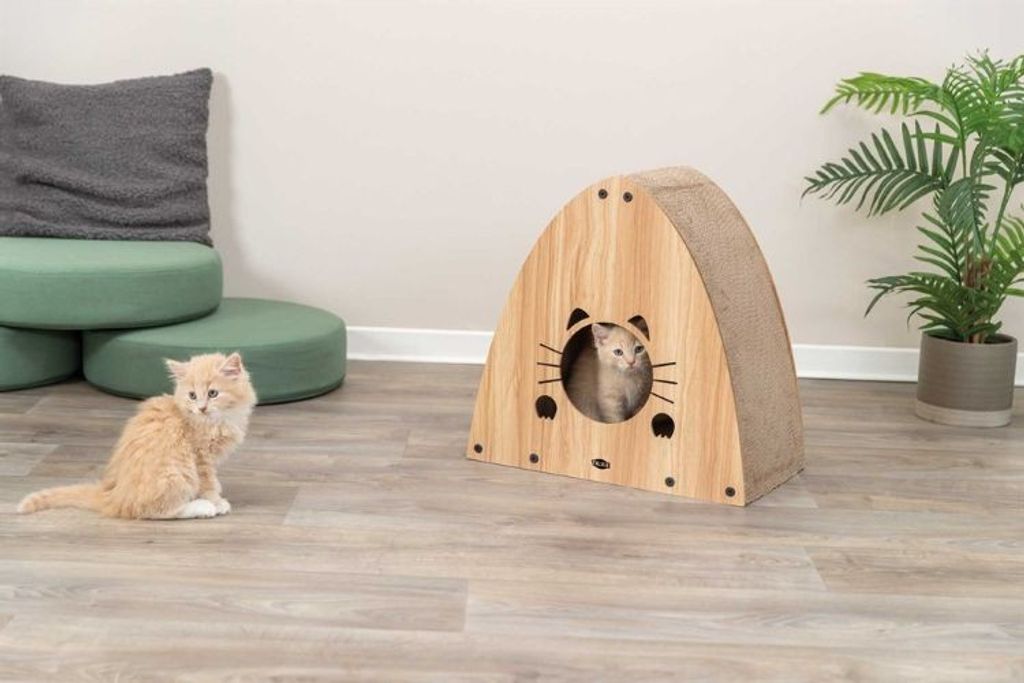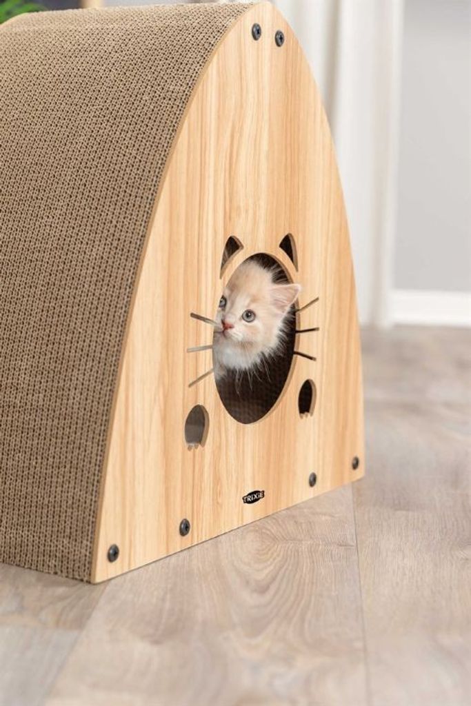 Den inbyggda klösmattan av slitstark MDF ger en hållbar yta för klösning, och kattmyntan lockar katten till lek och aktivitet. När wellpappen börjar slitas kan den enkelt bytas ut för att förlänga klöshusets livslängd.