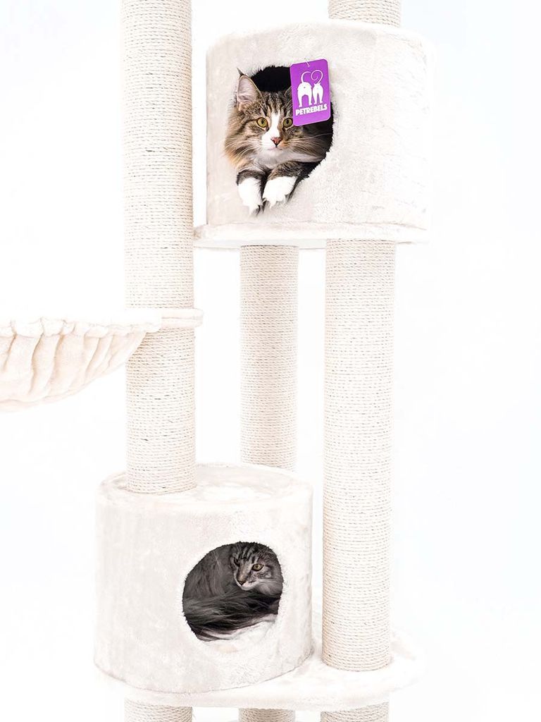 Materialet är gosigt och i mjuk plysch med ett sisal som är slitstarkt och hållbart vilket passar aktiva busiga katter som bäst. Klösträdet har många bekväma ställen din katt kan sova på, den mjuka hängmattan som kommer hålla din katt varm och bekväm men också två kojor din katt kan lägga sig i för att få vara ifred i en mörkare miljö som är gosig.