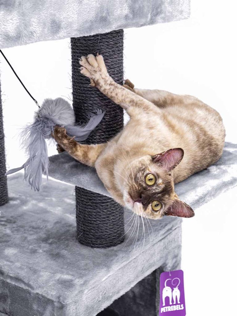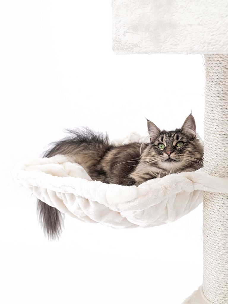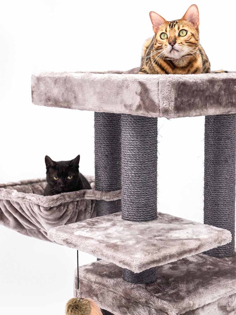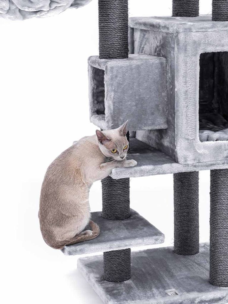 Med hjälp av dom tjocka klöspelarna kan din katt vässa och klösa sina klor hur mycket som helst. Det finns även en mjuk och gosig hängmatta i plysch som kommer få dina katter att sova som en kunglighet. I den mysiga grottan din katt kan gå in i har den möjlighet till att vara ifred i mörkare miljö med ett gosigt underlag.