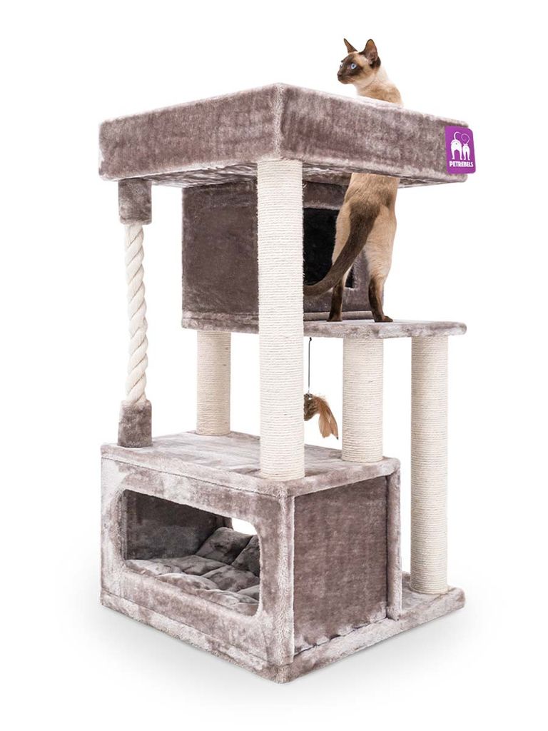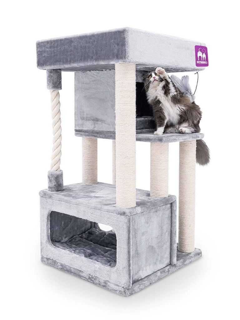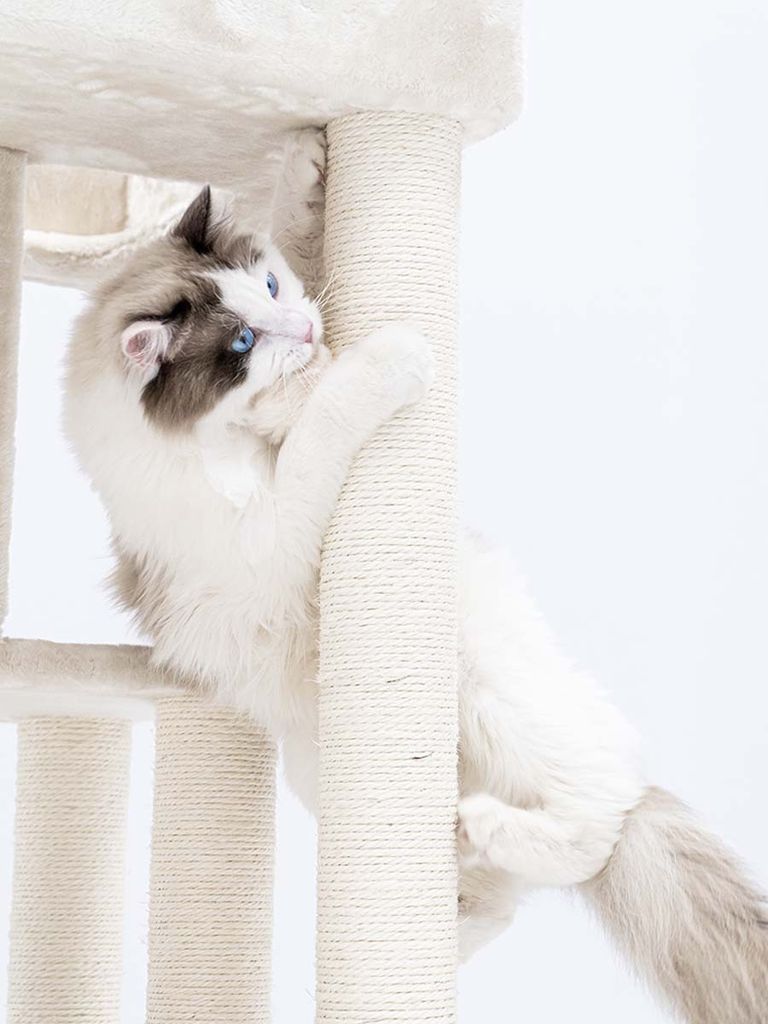 Ett perfekt klösträd för kattungar och små katter som kan göra av med sin energi på ett lekfullt sätt med både klöspelar, ett klösrep och mysiga kojor dom kan krypa in i.