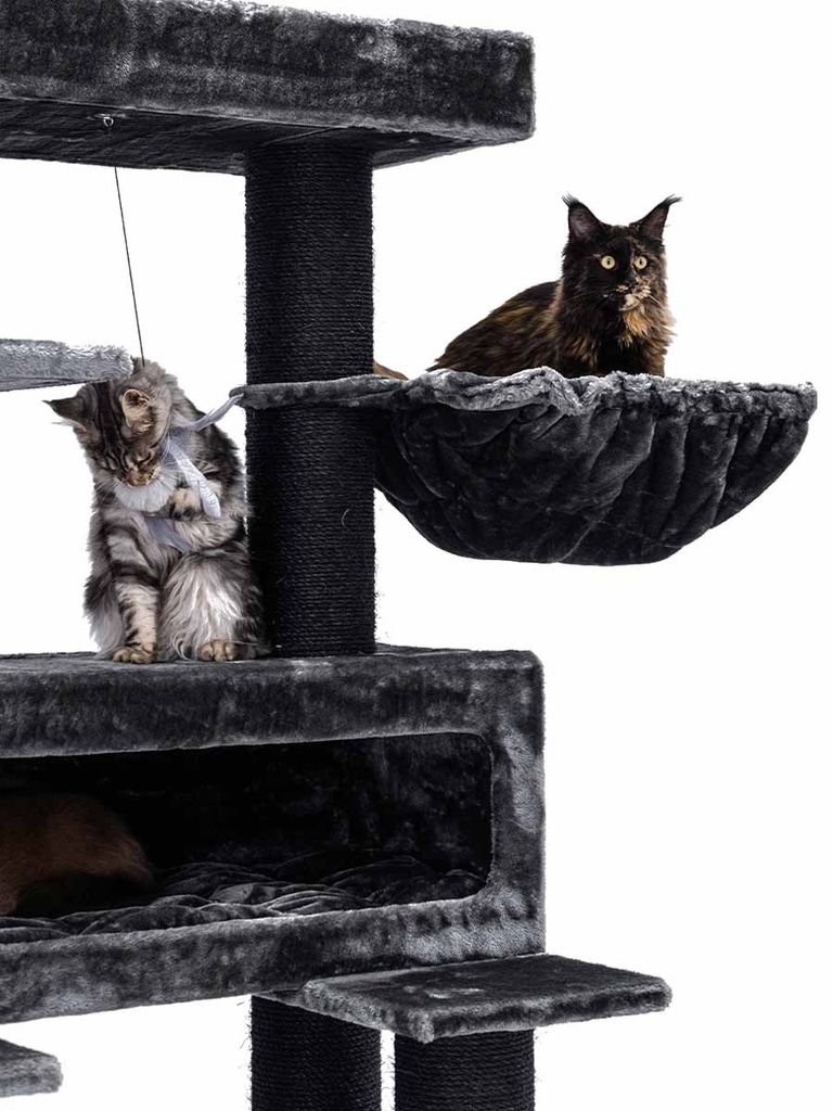 På denna kattmöbeln finns det en klöspelare, två hängmattor, en stor liggkorg och en mysig madrass längst upp för att ha syn över hela rummet. Den är 198 cm hög på höjden vilket ger dina katter en stor yta att vara på. Passar dig med en katt som gillar att vara för sig själv, men också för katter med mycket energi. Passar alla katter, stora katter och kattraser.