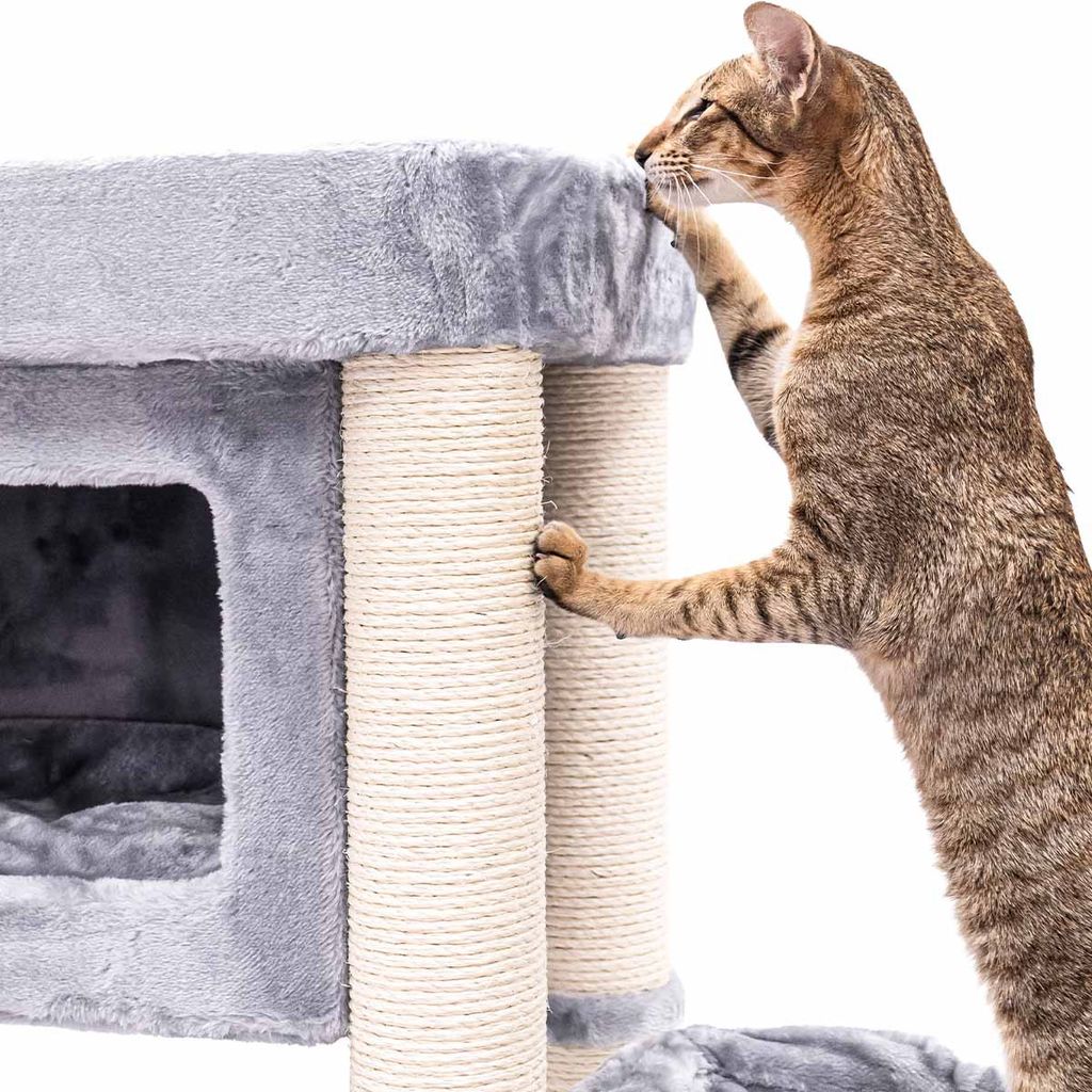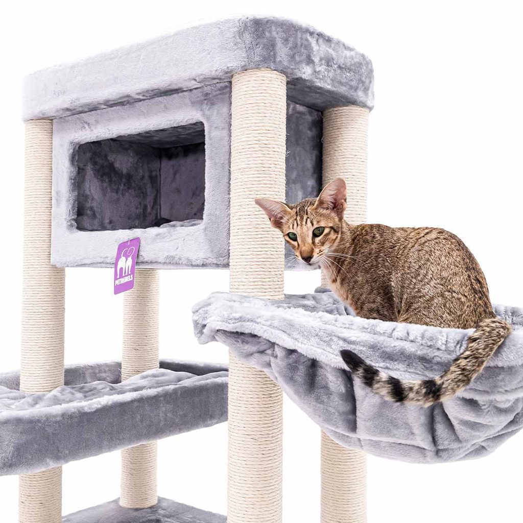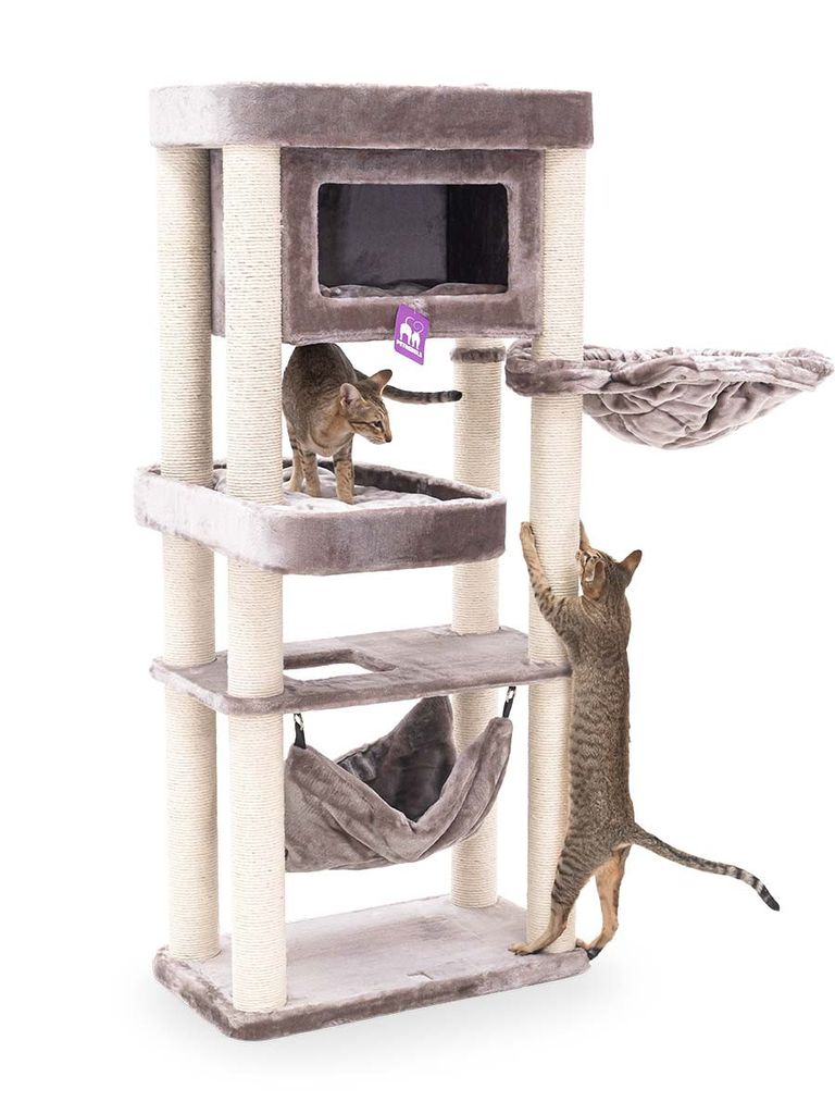 Det här klösträdet är väldigt rymligt och passar jättebra till stora katter då dom också får en gosig och rymlig plats att vila på. Det finns en mysig hängmatta i högre höjd i klösträdet där din katt kan sova ifred utan att bli störd.