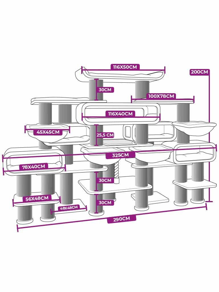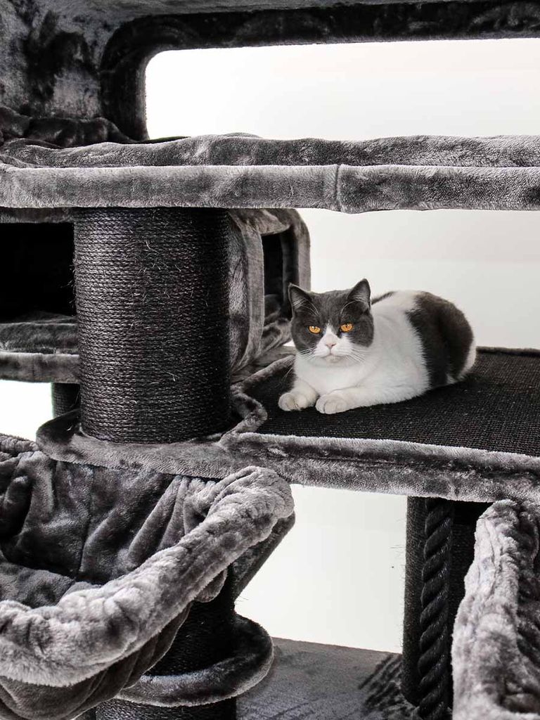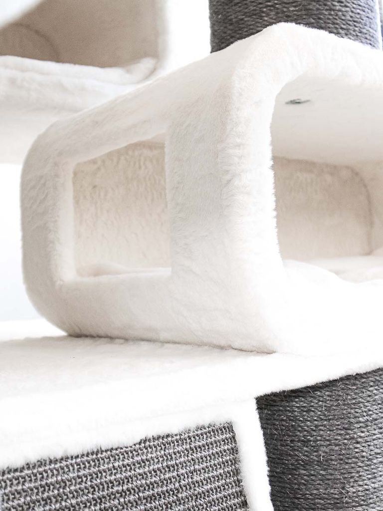Kattträdet kombinerar stabilitet, hållbarhet och en generös storlek. Den snygga utstrålningen kommer göra dig som ägare nöjd då dina katter har nånstans att klättra, klösa, leka men också njuta av djup vila.