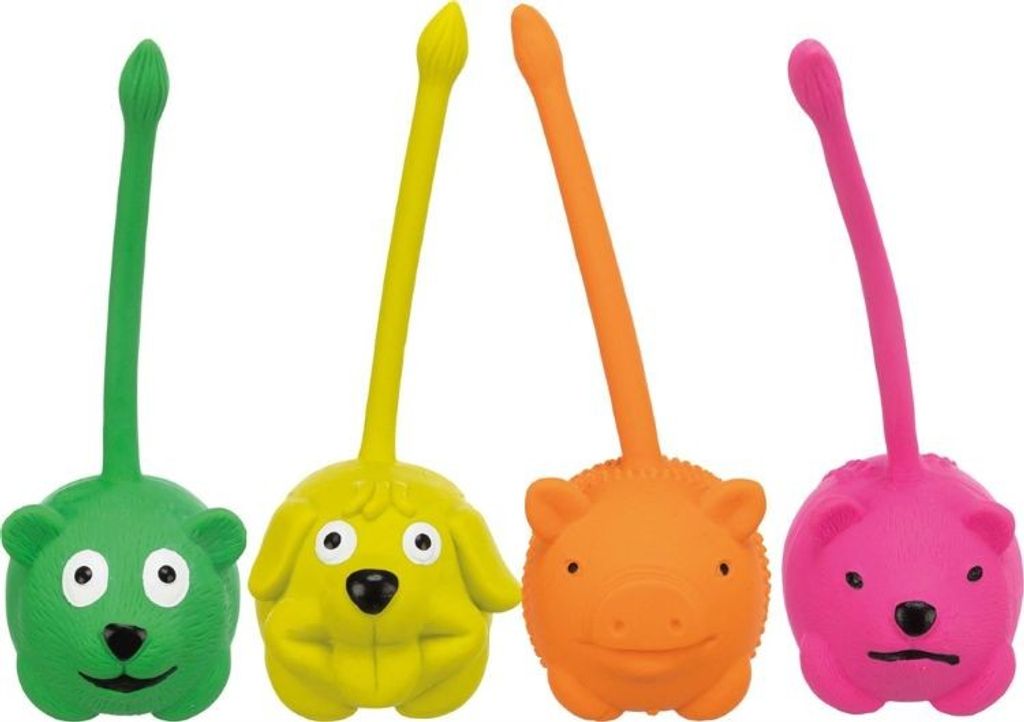 Färgglada latexdjur med lång svans och ett roligt ljud som gör leken ännu mer underhållande.