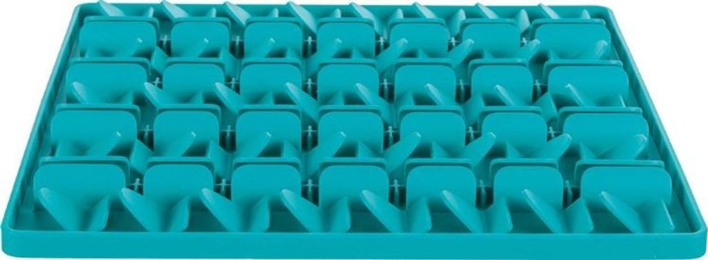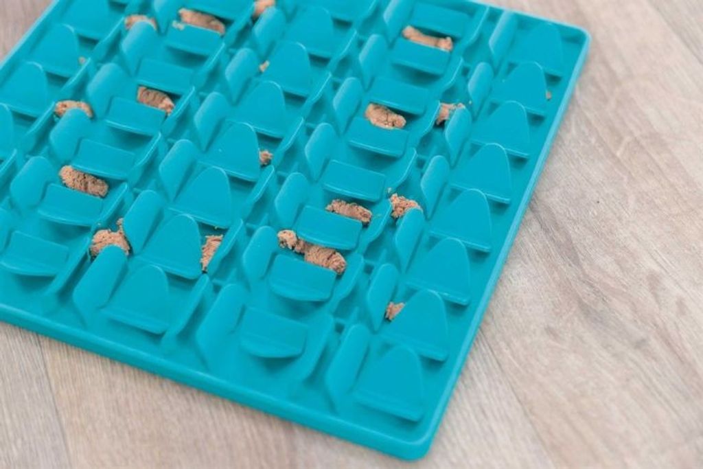 Mattan kan enkelt täckas med våtfoder, färskfoder eller foderpaté och för en extra spännande upplevelse kan den fyllas med godsaker och frysas in. De upphöjda kanterna förhindrar att vätska rinner över, och den halkfria silikonbotten ser till att mattan ligger stadigt under användning.