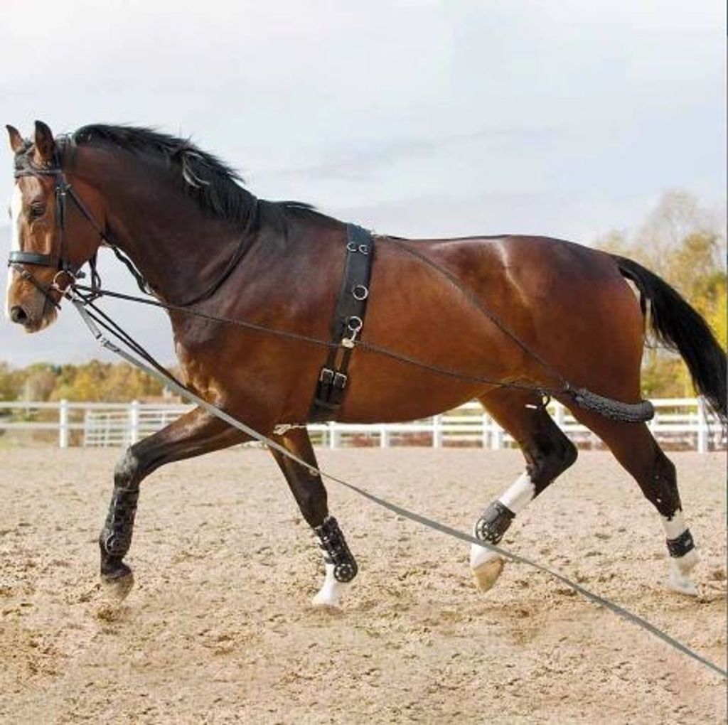 Justerbart longeringssystem som används när du tränar hästen från marken. Hjälper att stärka ryggmuskulatur och att uppmuntra hästen att lägga mer vikt på bakdelen. Kan enkelt anpassas till olika hästar och träningsnivåer. Utrustat med snabbspännen för enkel fastspänning.