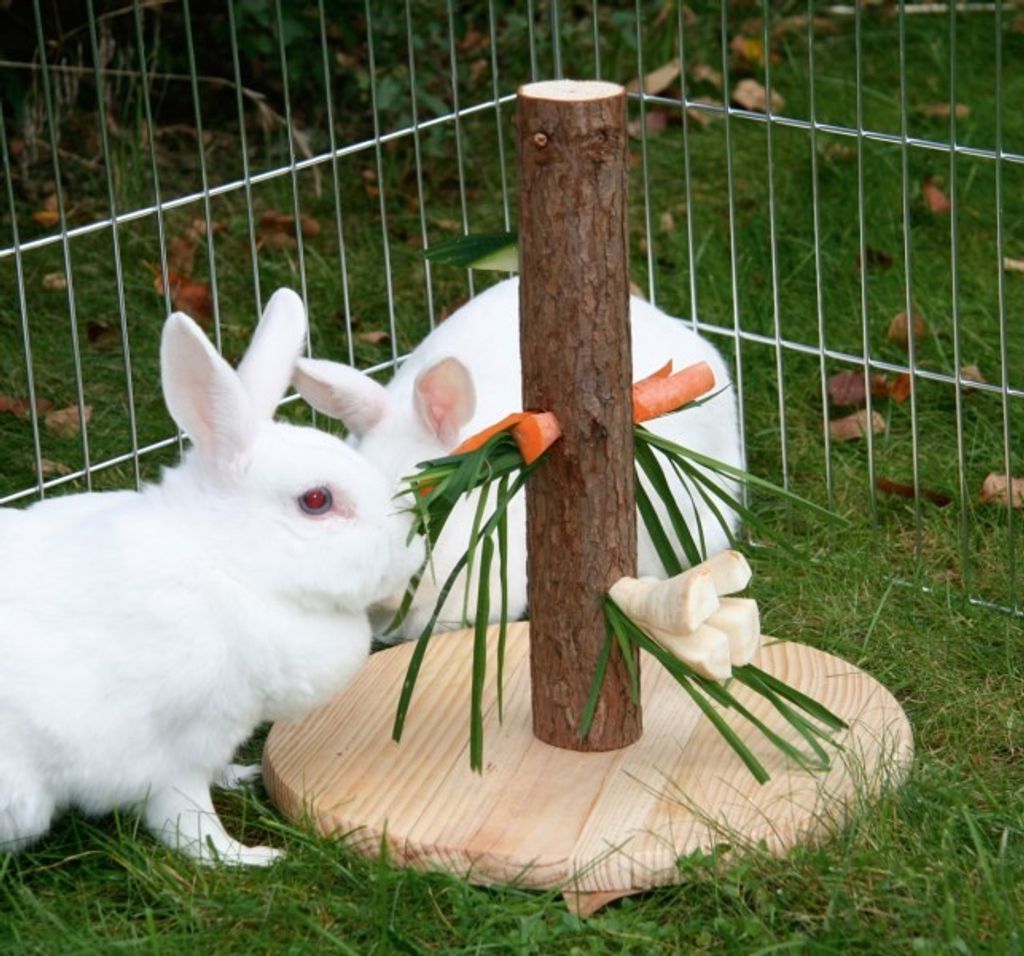 30cm högt träd med barken kvar och en bottenplatta i trä som gör att det står stabilt även om du har flera kaniner som äter samtidigt.