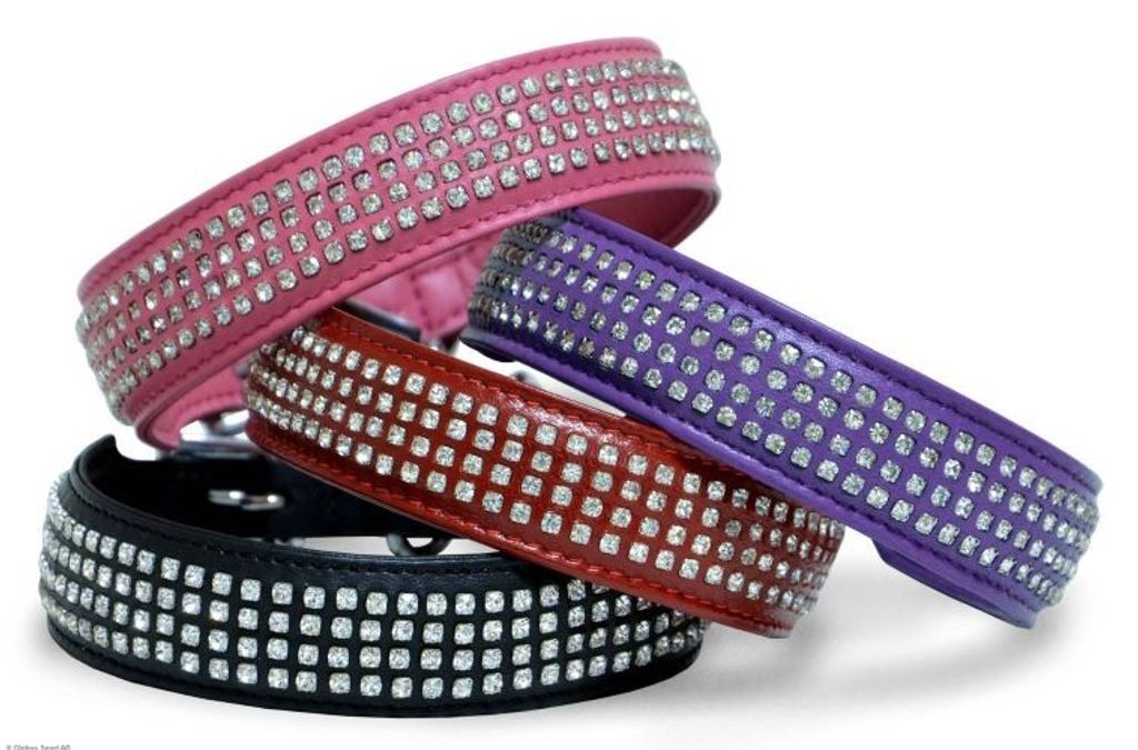 Mjukt halsband i lammskinn med snygga kristaller i 4 rader. Justerbar passform så du enkelt kan se till att halsbandet sitter perfekt på just din hund.
