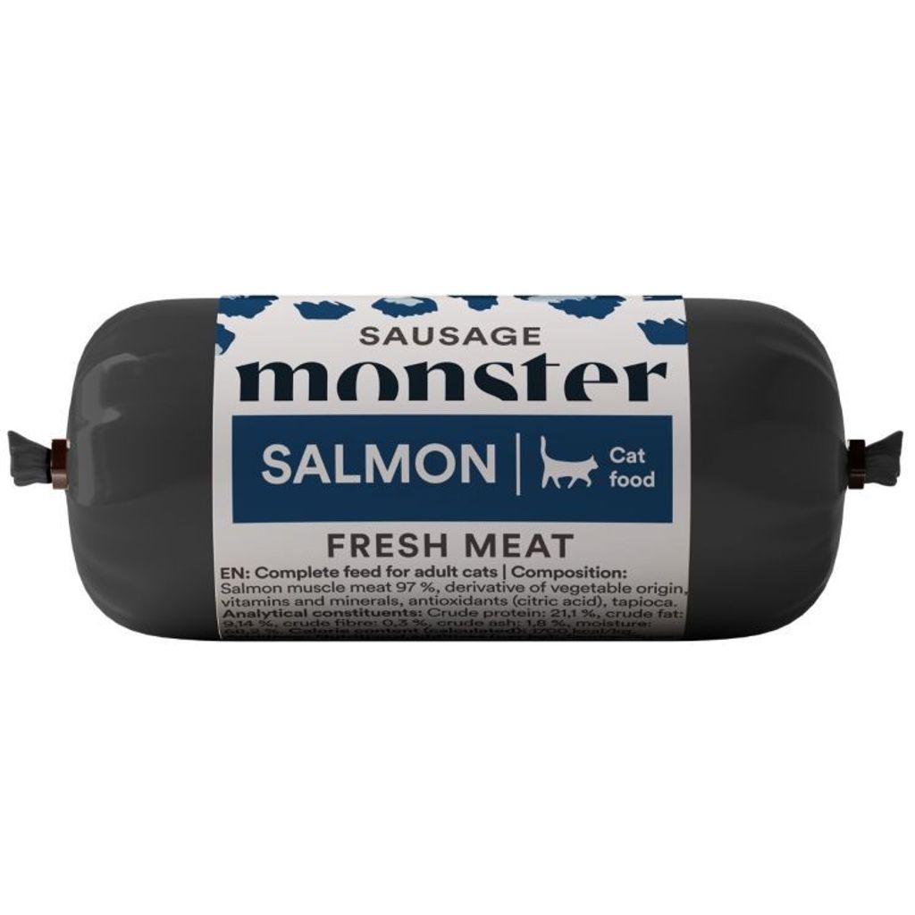 Även den mest kräsna katten har svårt att motstå denna smakrika, spannmålsfria korv från Monster. Monster Cat Sausage Salmon är en köttrik korv där kött från lax är både första ingrediens och den enda proteinkällan. Tack vare sin höga smaklighet fungerar den lika bra som ett komplett helfoder som ett extra lyxigt godis vid sidan av. Den mjuka och smidiga konsistensen gör korven enkel att skära i bitar och ta med sig i fickan, eller varför inte riva över kattens vanliga foder för en välsmakande topping.