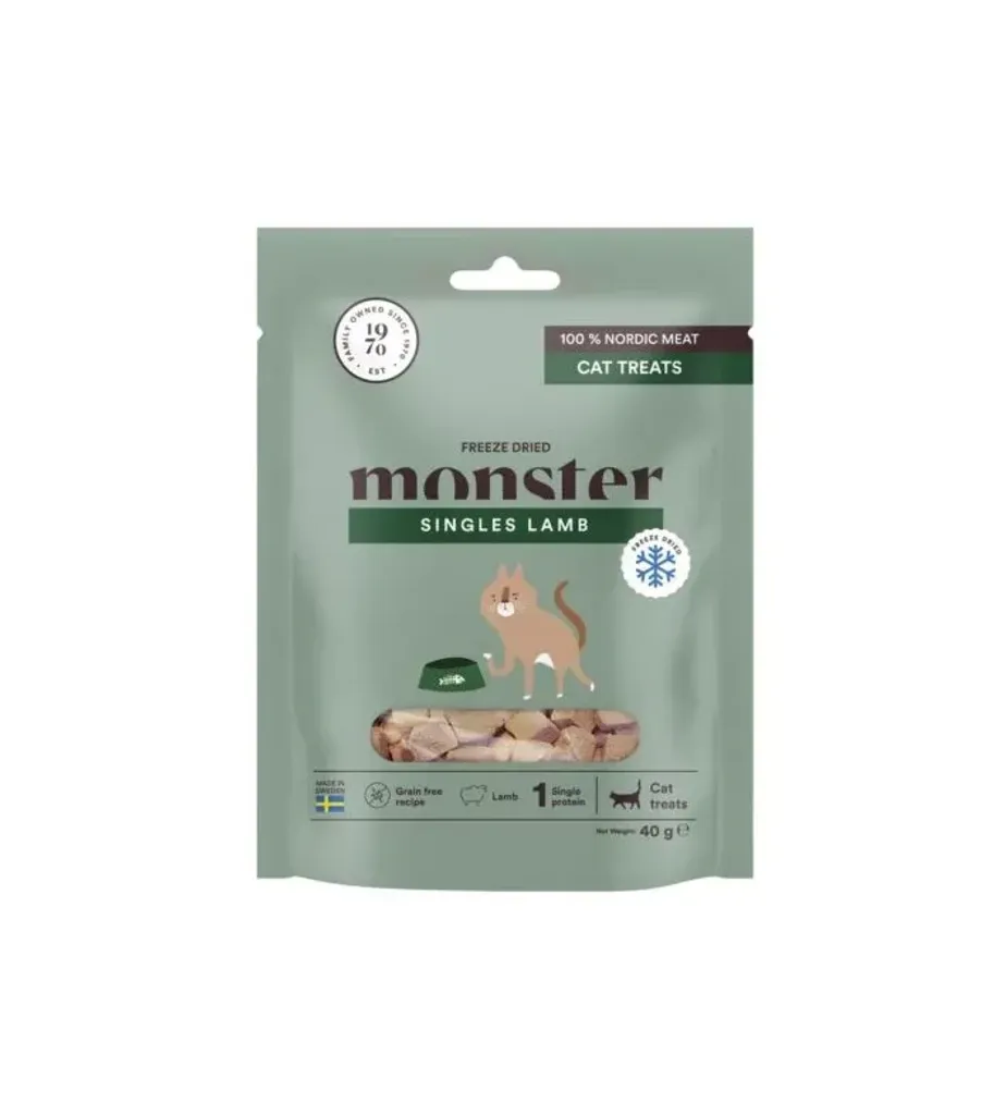 Monster Freeze Dried Treats Singles Lamb frystorkade godbitar är oemotståndliga för katter i alla åldrar