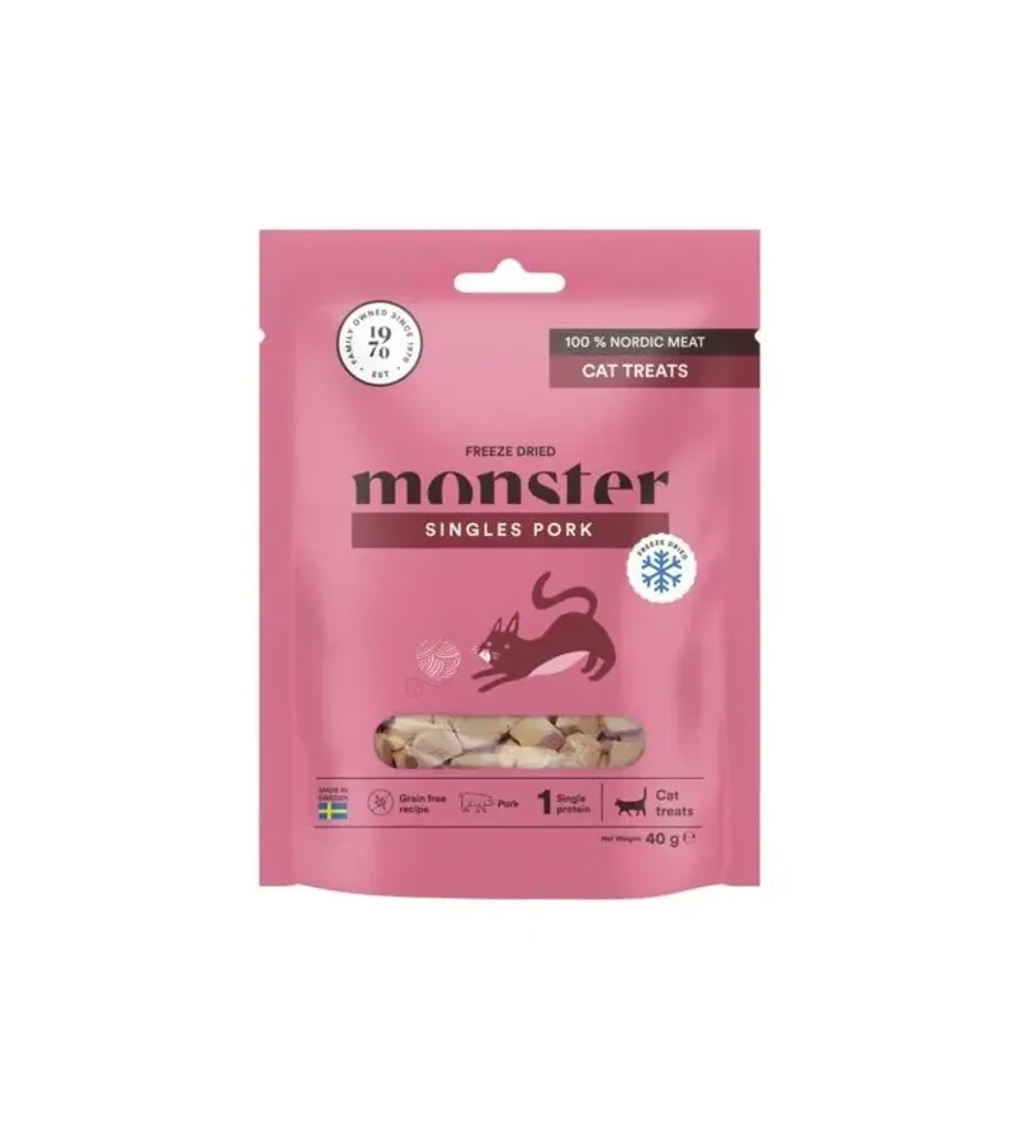 Monster Freeze Dried Treats Singles Pork frystorkade godbitar är oemotståndliga för katter i alla åldrar