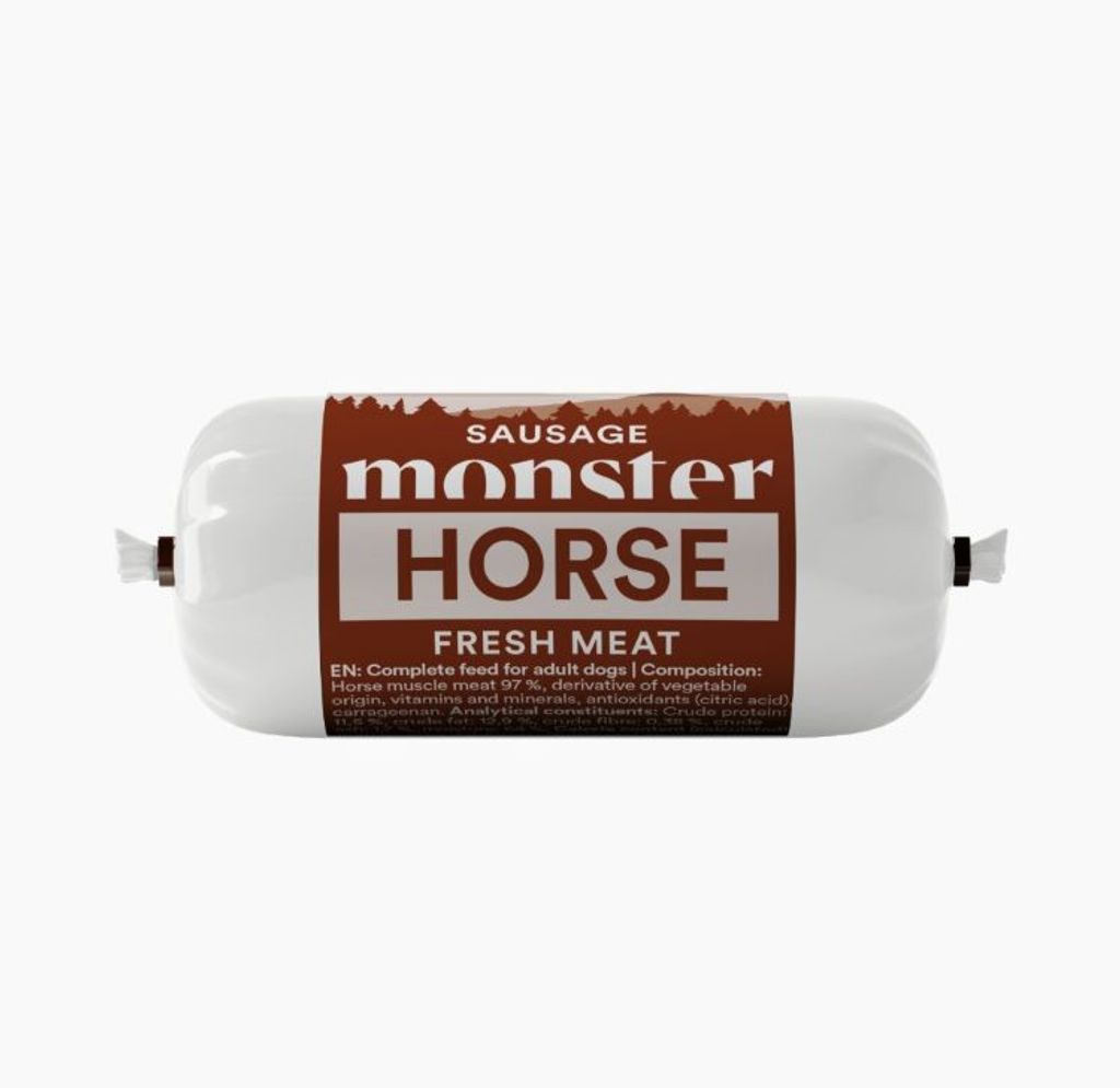 Även den mest kräsna hunden har svårt att motstå denna smakrika, spannmålsfria korv från Monster. Monster Sausage Horse är en köttrik korv där hästkött är både första ingrediens och den enda proteinkällan. Tack vare sin höga smaklighet fungerar den lika bra som ett komplett helfoder som ett extra lyxigt godis vid sidan av. Den mjuka och smidiga konsistensen gör korven enkel att skära i bitar och ta med sig i fickan, eller varför inte riva över hundens vanliga foder för en välsmakande topping.