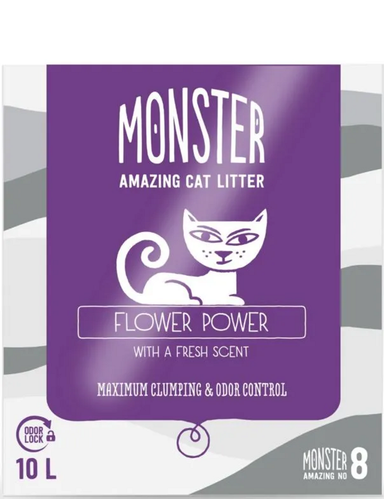 Monster kattsand Flower Power är klumpbildande kattsand med en doft som för tankarna till en blommig äng. Den innehåller ett ”odor lock system” med aktivt kol, för optimal odörkontroll.