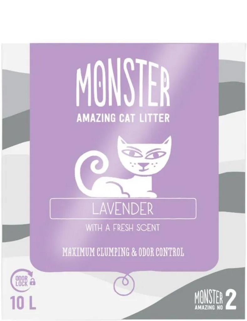 Monster kattsand Lavender är en klumpbildande kattsand som doftar lavendel. Den innehåller aktivt kol, för optimal odörkontroll. Dessutom dammar den väldigt lite vilket är bra både för ägare och katter!
