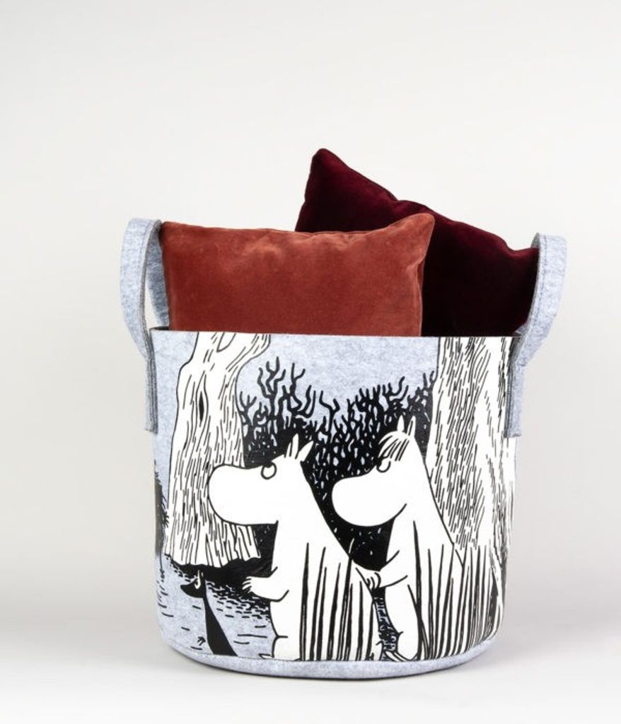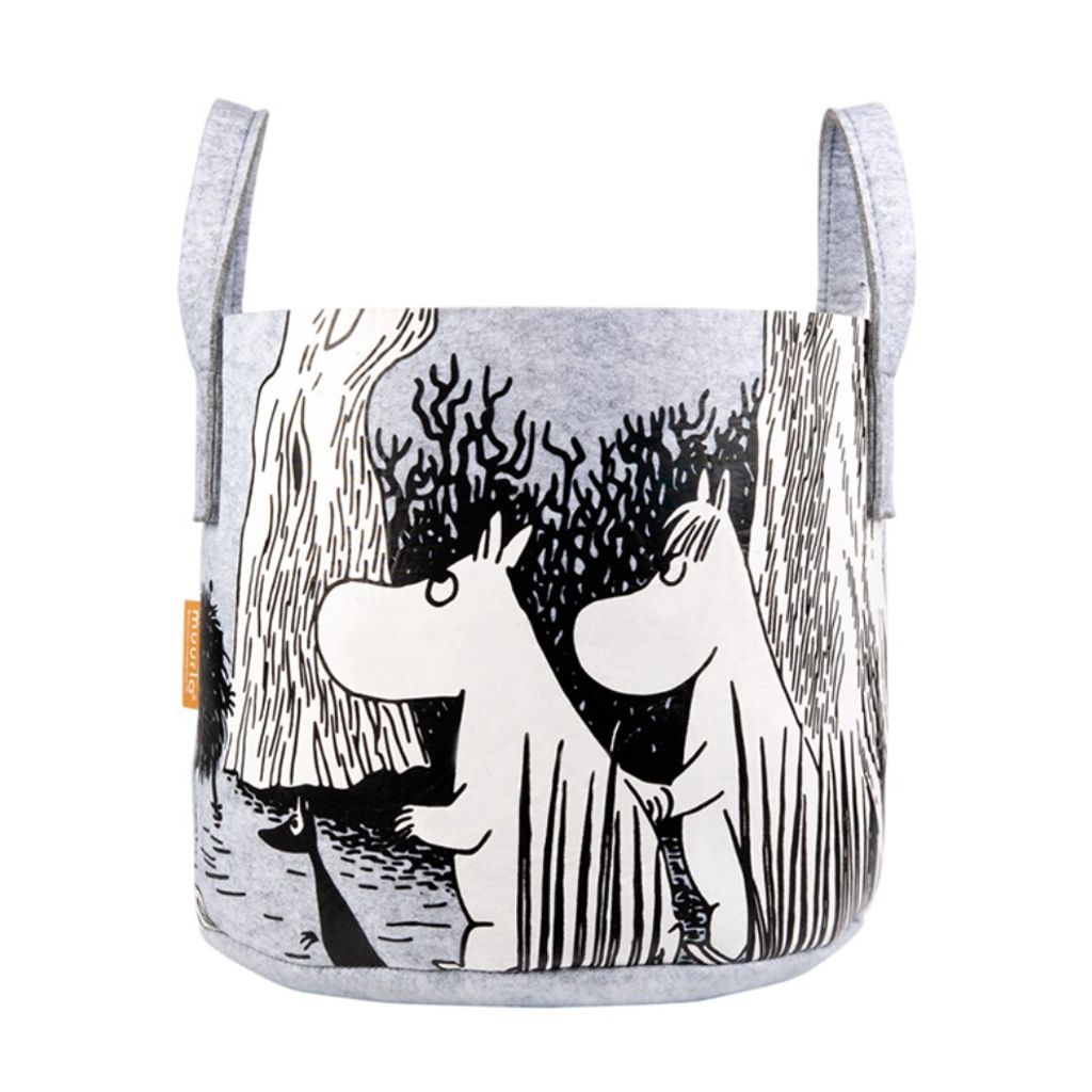 Förvaringskorg med vackert Mumin-tryck. Den stilrena gråa färgen och det otroligt fina trycket med mumintroll som utforskar gör att den verkligen passar in i alla hem.