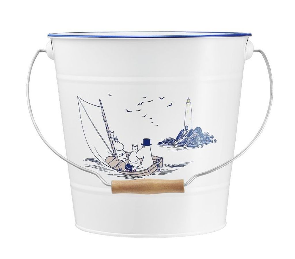 Hink i metall med ett vackert Mumin-tryck och som rymmer 10L.