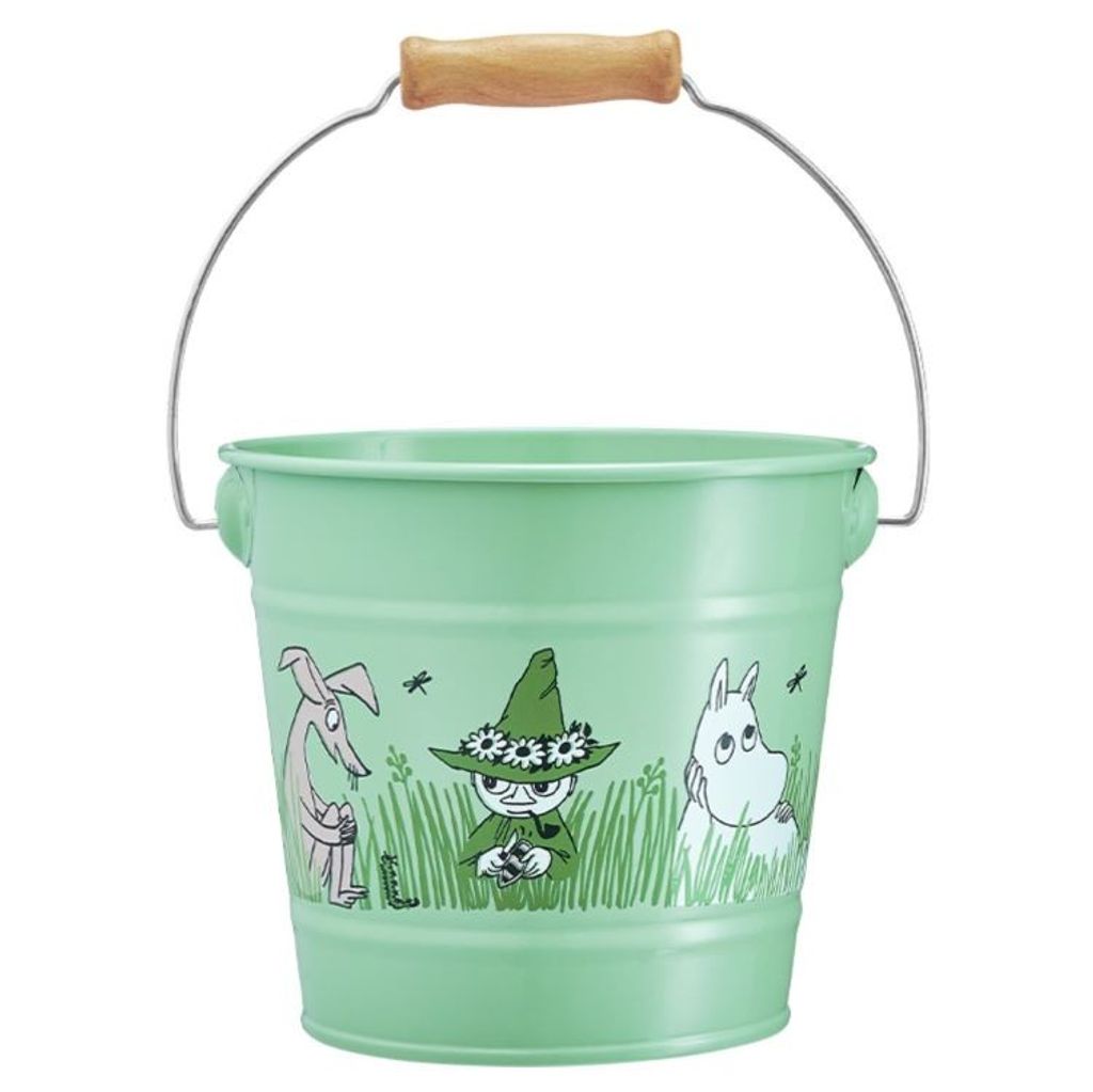 Hink i metall med ett vackert Mumin-tryck. Metallhandtaget har trä där du håller, vilket gör att den är enkel och bekväm att bära.