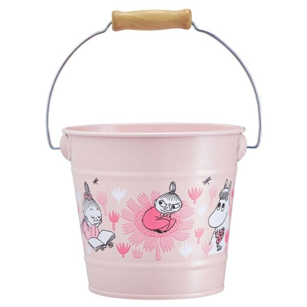 Hink i metall med ett vackert Mumin-tryck. Metallhandtaget har trä där du håller, vilket gör att den är enkel och bekväm att bära.