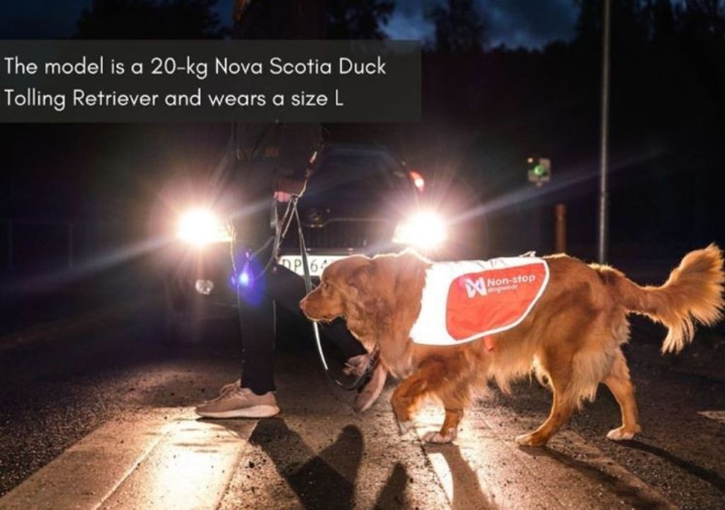 Rexlextäcke från Non-Stop Dog Wear. Västen är i en kraftigt orange färg och med stora partier högkvalitativa 3M-reflexer som lyser upp ordentligt i mörker när de träffas av ljus. Det gör att du kan känna dig extra säker på att din hund syns även på långt håll i mörker.