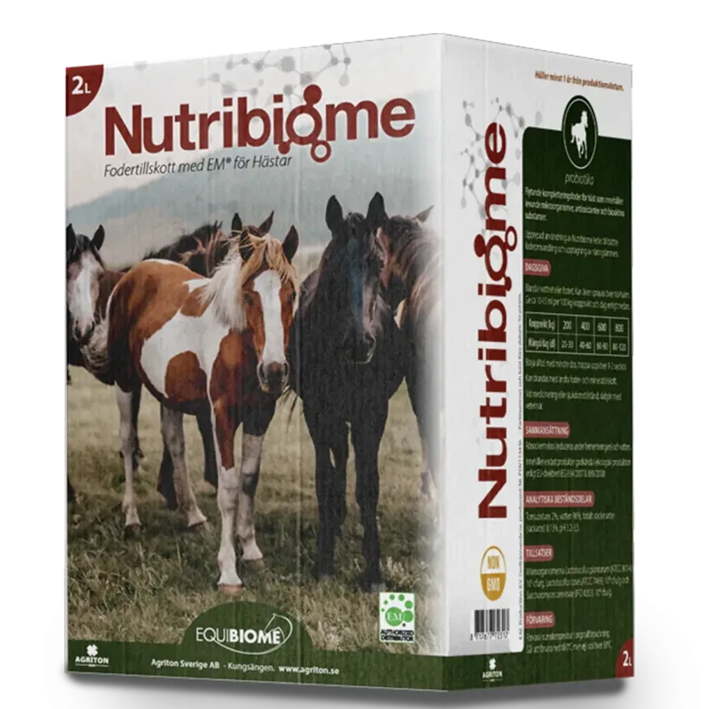 Nutribiome är flytande probiotika som utvecklats specifikt för hästar men fungerar för alla slags djur. Ingen karenstid inför tävling. Det är en rik källa på probiotiska mikroorganismer, antioxidanter och bioaktiva substanser. Alla dessa kan bidra till en förbättrad foderomvandling och näringsupptag.